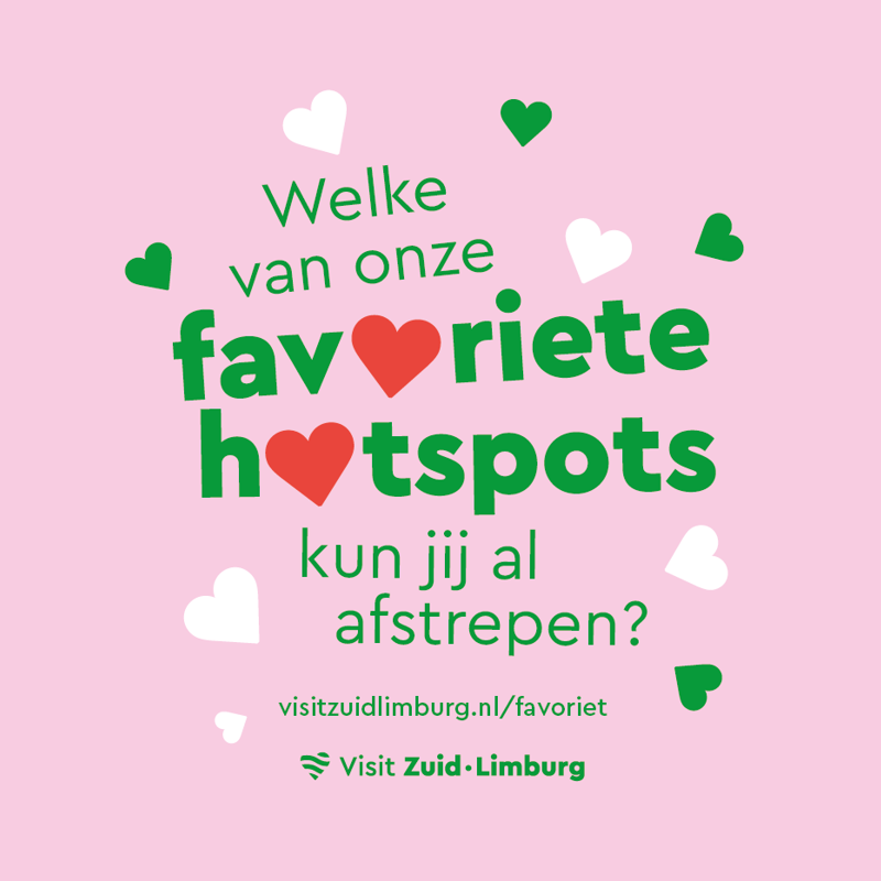 Zuid-Limburg. Hier blijf je favorieten verzamelen. Dat is de boodschap van de nieuwe spreidingscampagne die vanaf deze zomer in de hele regio wordt uitgerold. Samen met onze partners nodigen we bezoekers en inwoners uit om steeds nieuwe favoriete hotspots te ontdekken en hun eigen favorietenlijst samen te stellen. Denk aan uitjes, routes, evenementen en meer. Op deze manier creëren we meer zichtbaarheid voor ondernemers.